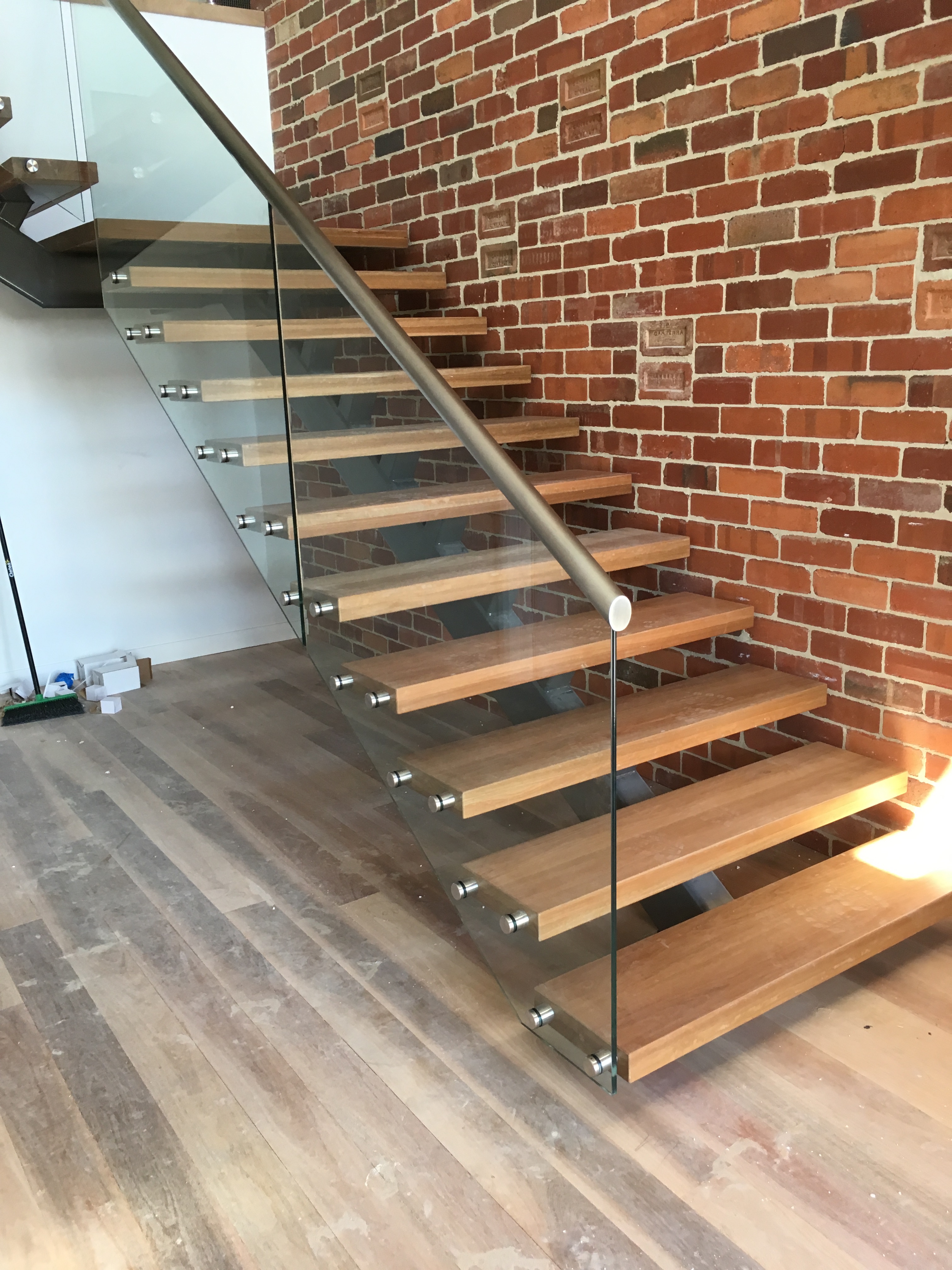 Open style, solid NSW Spotted Gum treads on central powder coated metal spine. Stainless steel handrail capping to glass balustrade – Hackett ACT