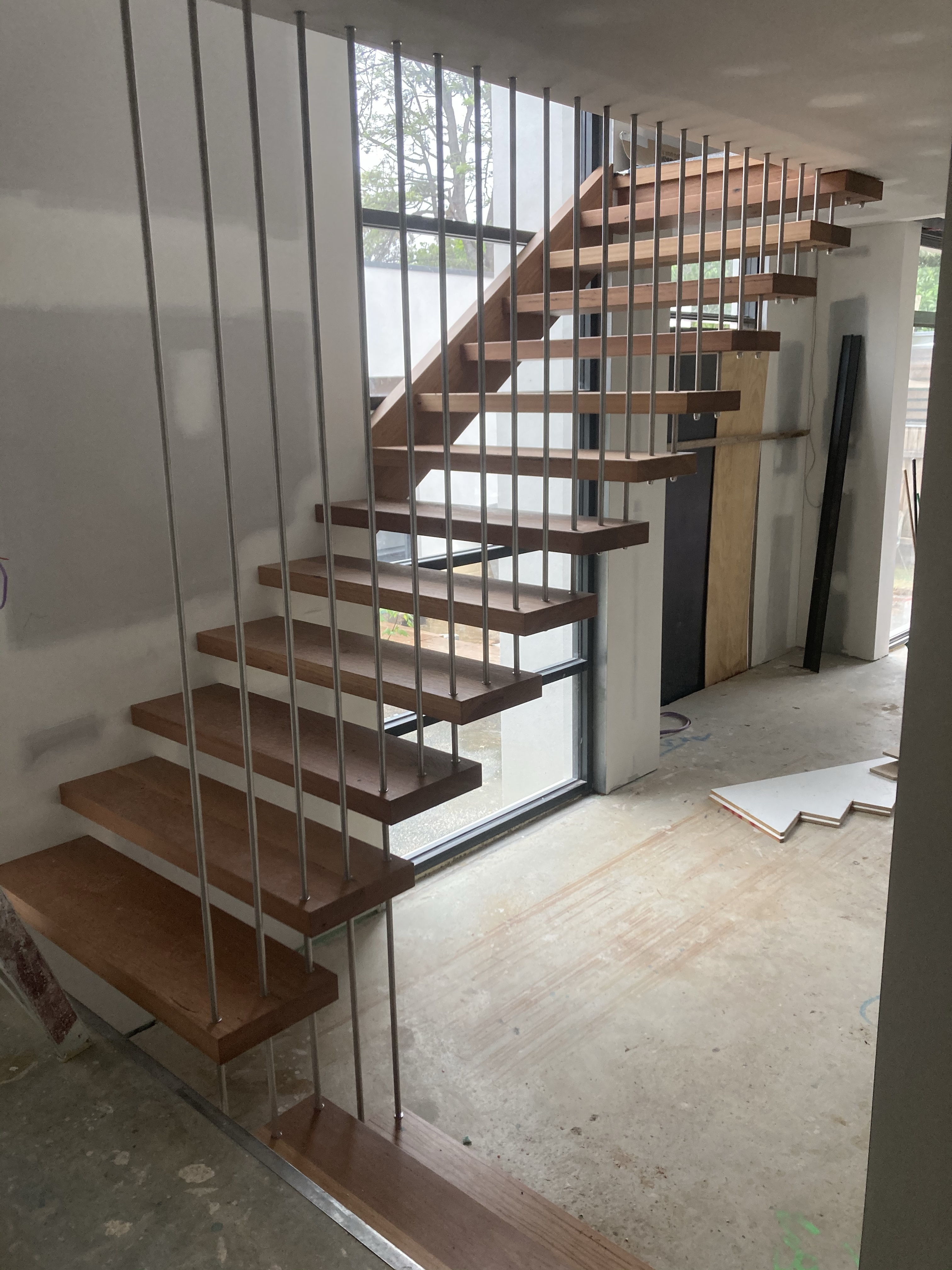 Open timber tread ‘floating’ stair with stringer hidden in the wall. Suspended stainless steel rods act as balustrades.