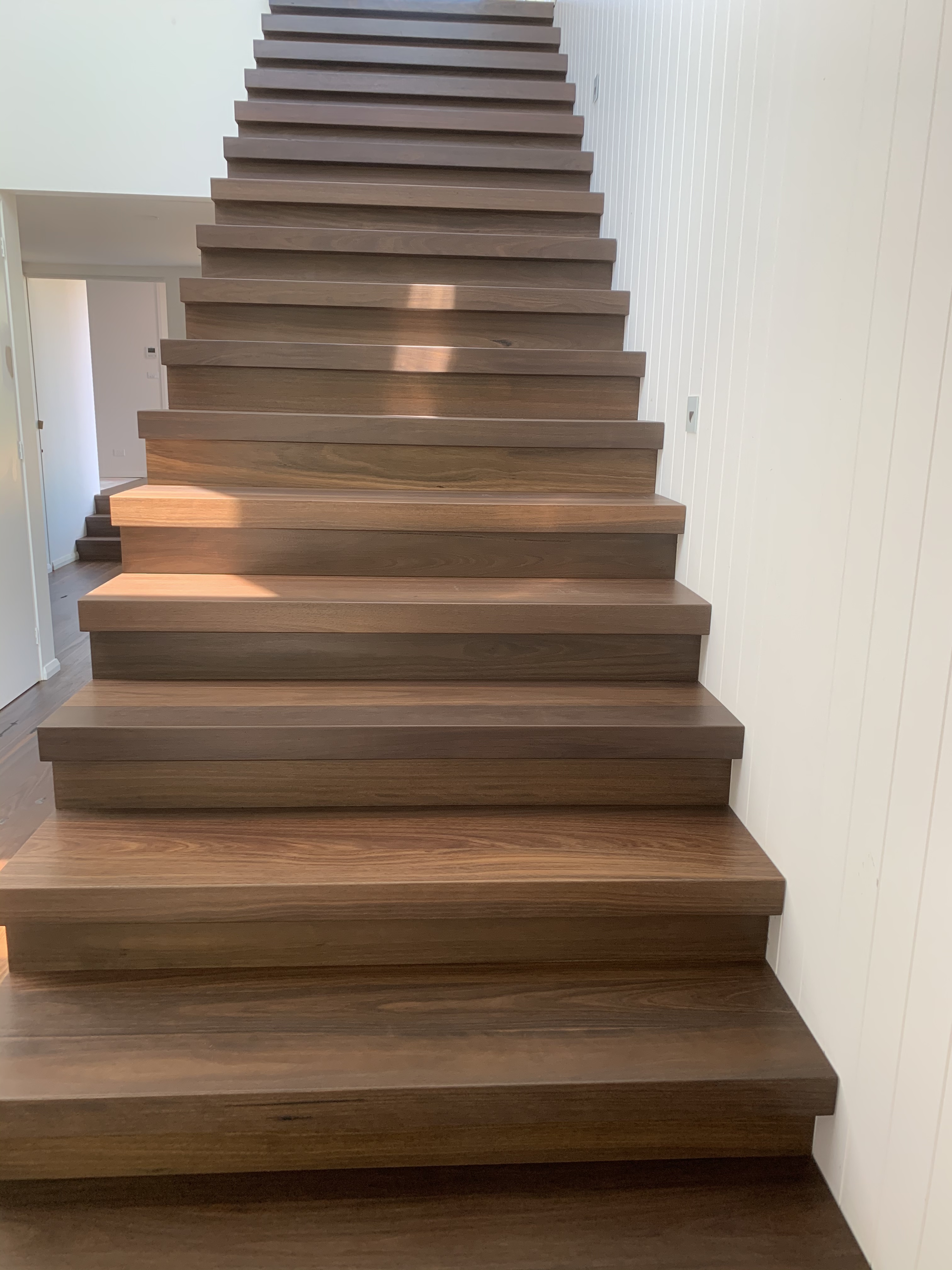 Timber overlays made from “roasted peat” timber floor boards and laid onto an MDF stair to create a seamless finish with the flooring. Overlays manufactured by Blackforest Joinery and laid by Mystic Timber Floors.